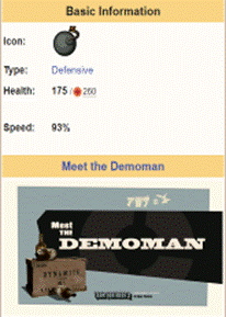 The Demoman is a scrumpy-swilling demolitions expert from the Scottish town of Ullapool, and is one of the most versatile members of the team. A master of explosives, the Demoman strategically deals massive amounts of indirect and mid-range splash damage. Armed with his Grenade Launcher and Stickybomb Launcher the Demoman uses his one good eye and the knowledge of his surrounding environment for well-timed sticky bomb detonations that send enemies skyward, often in many pieces. Should anyone get past his explosive ordinance, however, they will be shocked to learn the Demoman is extremely proficient at melee combat, being one of the deadliest melee users in the game, with a variety of powerful melee unlocks in his arsenal. The Demoman excels at swift destruction; he can bounce his grenades at creative angles to wreak havoc on enemy Sentry Gun emplacements while remaining safely out of sight. His sticky bombs are a perfect tool for area denial, and are effective at keeping opponents away from any carts, control points, or Intelligence that he deems off-limits. The Demoman is voiced by Gary Schwartz. Tips: · Hit MOUSE1 to fire Stickybombs and then press MOUSE2 to detonate them later. · Press E to call for a Medic if you get hurt. Nearby Medics will be notified of your need. · With the Stickybomb launcher, the longer you hold down the fire button, the farther the shot will go. · Set off Stickybombs beneath your feet to sticky jump up to great heights.