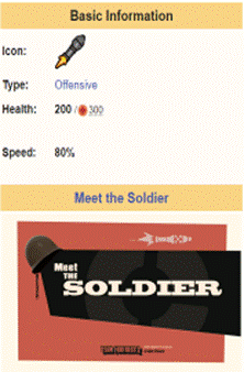The Soldier is a crazed, jingoistic patriot from Midwest, USA. Tough and well-armed, he is versatile, capable of both offense and defense, and a great starter class to get familiar with the game. Well-balanced and possessing both survivability and mobility, the Soldier is considered one of the most flexible classes in Team Fortress 2. Despite his low ground movement speed, he is capable of using rocket jumps to reach his destination quickly. His large health pool is second only to that of the Heavy, and his wide array of armaments and weaponry allows him to bring whatever weapon or equipment is best suited to the situation at hand. The Soldier is well known for his spectacular rocket jump. In defiance of all good sense and judgment, the Soldier can detonate a rocket at his feet and launch himself skyward at the cost of some health (which can be reduced by the Gunboats. This ability allows the Soldier to navigate the battlefield by air, appear from unexpected places, and reach areas off-limits even to the Scout's double jump. The Soldier was voiced by the late Rick May. Tips: · You can rocket jump to great heights by simultaneously jumping and firing a rocket at the ground. · Crouching and jumping simultaneously while aiming at the ground will propel you farther at the cost of more self-damage. · Aim rockets at enemy's feet to ensure they can't avoid the explosion damage. · Make sure you keep your Rocket Launcher loaded. Hit R to reload it at any time. Press E to call for a Medic if you get hurt. Nearby Medics will be notified of your need. TF2C Weapons: The Soldier has 2 weapons. The RPG, Slot: Primary Ammo Loaded:1 Ammo Carried:20 Damage:Base 145 Crit 435 Stats:Rockets travel in an arc +30% damage bonus -25% projectile speed -75% clip size The Gunboats, Slot: Secondary Gunboats Stats:-60% blast damage from explosive jumps. |